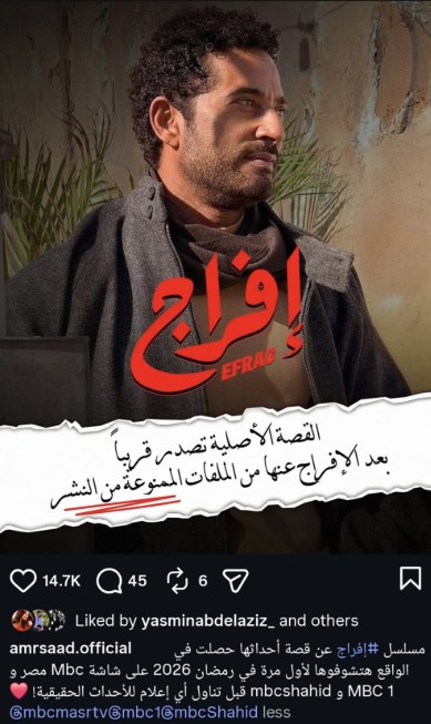 وكتب عمرو سعد من خلال حسابه الرسمي عبر موقع تبادل الصور والفيديوهات القصيرة إنستجرام:مسلسل إفراج عن قصة أحداثها حصلت في الواقع هتشوفوها لأول مرة في رمضان 2026 على شاشة Mbc مصر و Mbc 1 وشاهد قبل تناول أي إعلام للأحداث الحقيقية!.
