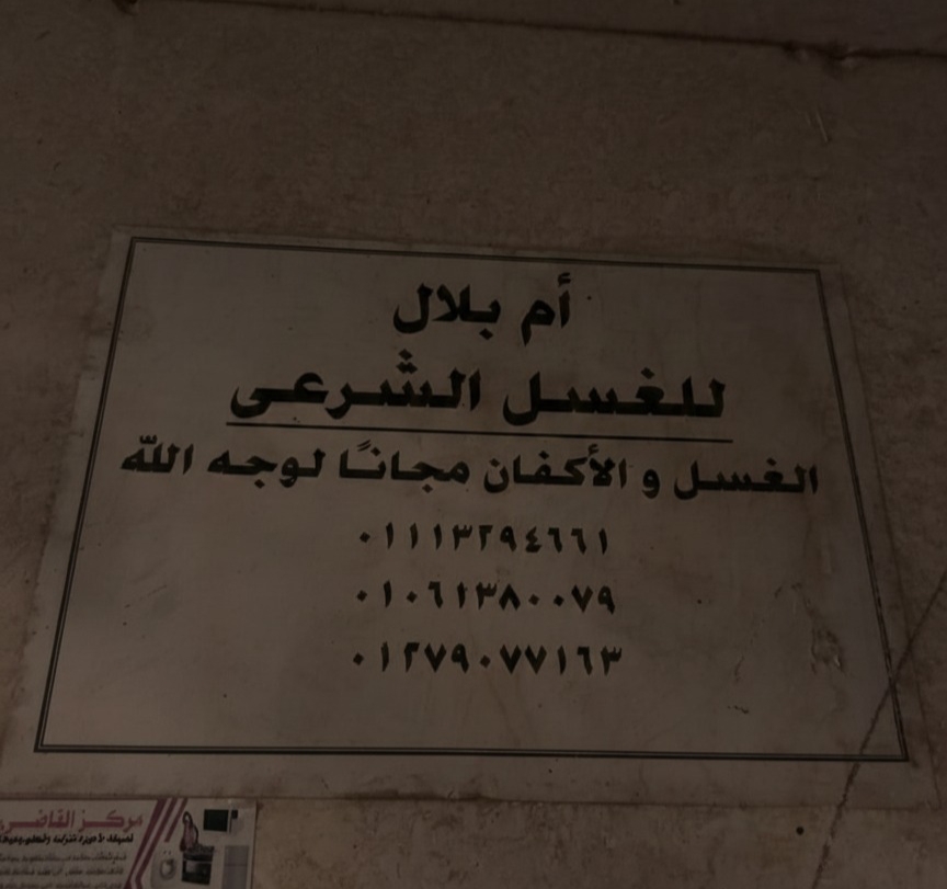 توجهنا إلى العقار المشار إليه، ولم نر أي لافتة تدل على وجود نشاط حزبي، وبمجرد وصولنا العقار حاولنا إيجاد لافتة أو شعار يدل على وجود كيان سياسي، لكن الصدمة جاءت غير متوقعة، إذ واجهتنا لافتة كبيرة تعلن عن «أم بلال للغسل الشرعي الغسل بالمجان والأكفان لوجه الله».