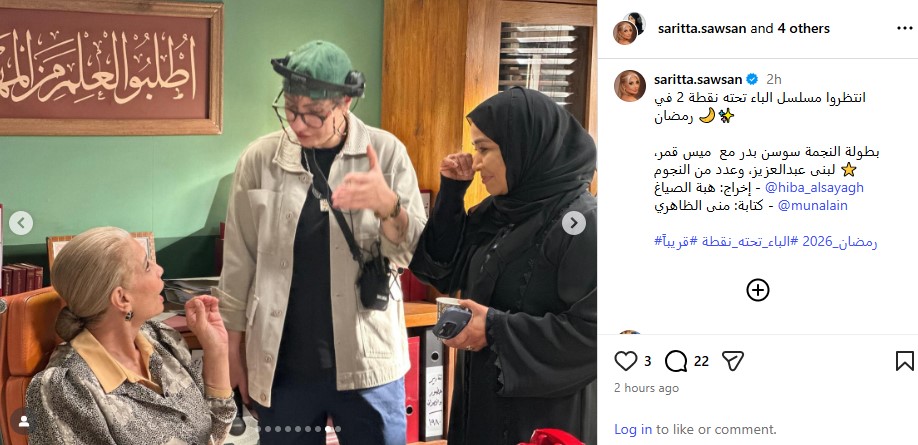 ونشرت سوسن بدر الكواليس التي جمعتها بالفنانة إيمان السيد وعدد من النجوم، من خلال حسابها الرسمي عبر موقع تبادل الصور والفيديوهات القصيرة إنستجرام، وعلقت: انتظروا مسلسل الباء تحته نقطة 2 في رمضان بطولة النجمة سوسن بدر مع ميس قمر، لبنى عبدالعزيز، وعدد من النجوم، إخراج: هبة الصياغ، كتابة: منى الظاهري.