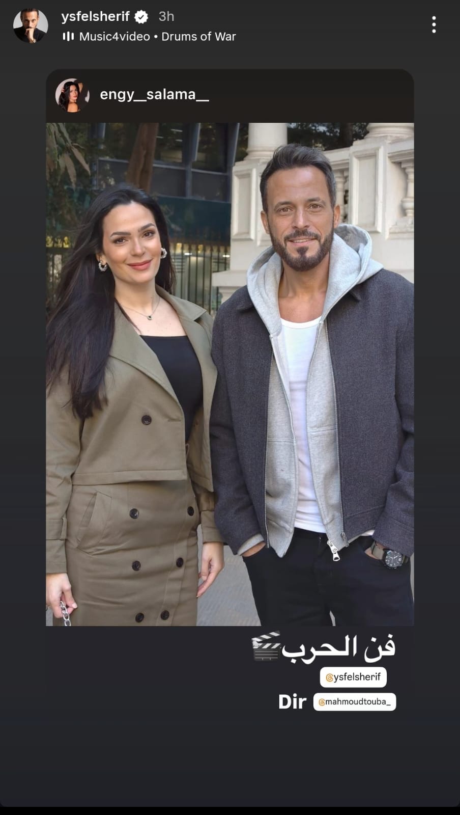 ونشر يوسف الشريف صورة برفقة إنجي سلامة إحدى أبطال العمل، وذلك من خلال حسابه الرسمي عبر موقع تبادل الصور والفيديوهات القصيرة إنستجرام، عبر خاصية ستوري، وعلق: فن الحرب.