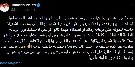وكتب تامر حسين من خلال حسابه الرسمي عبر موقع التواصل الاجتماعي إكس، قال: بعيداً عن المُتاجرة والمُزايدة فى محبة شيرين اللى عايزلها الخير يناشد الدولة إنها ترعاها وشيرين تفضل تحت عينهم مش أقل من ٦ شهور ع التوالى وف مستشفيات خاصة للدولة مش برعاية زُملاء أو أصدقاء مهما كانوا قريبين لا يستطعون الرعاية الطبية الشاملة والكاملة ومش حايقدروا على شيرين لو زهقت وعازت ترجع بيتها.