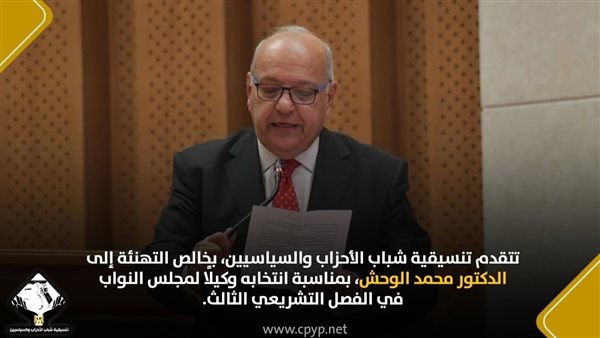تتقدم تنسيقية شباب الأحزاب والسياسيين، بخالص التهنئة إلى الدكتور محمد الوحش، بمناسبة انتخابه وكيلًا لمجلس النواب في الفصل التشريعي الثالث.