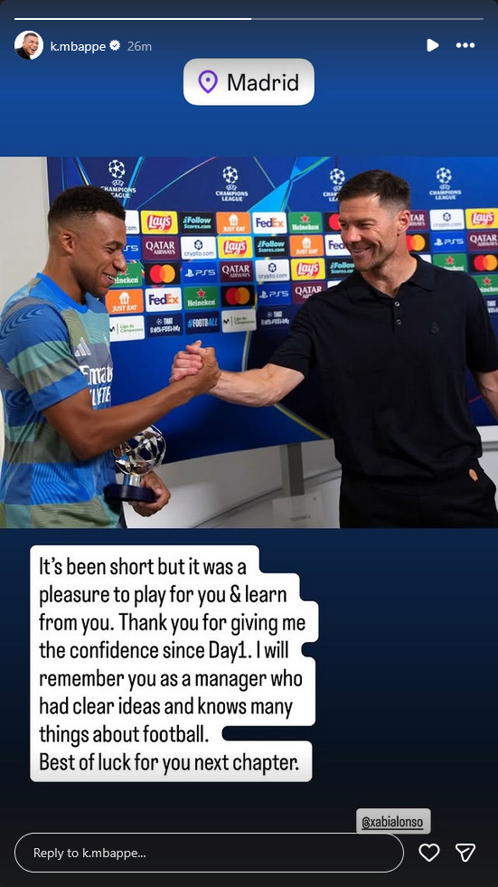 كتب هداف الفريق، النجم الفرنسي كيليان مبابي، عبر حسابه على "إنستغرام": "كانت فترة وجيزة، ولكن كان من دواعي سروري اللعب بقيادتك والتعلم منك".