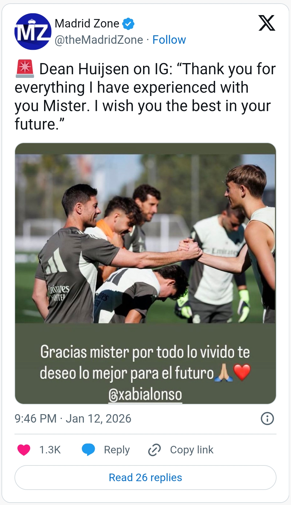 بينما كتب المدافع الشاب دين هويسن: "شكراً لك يا مدرب على كل ما تشاركناه، أتمنى لك كل التوفيق في المستقبل"، وشكره أيضاً راؤول أسينسيو معتبراً أنه "يستحق الأفضل".