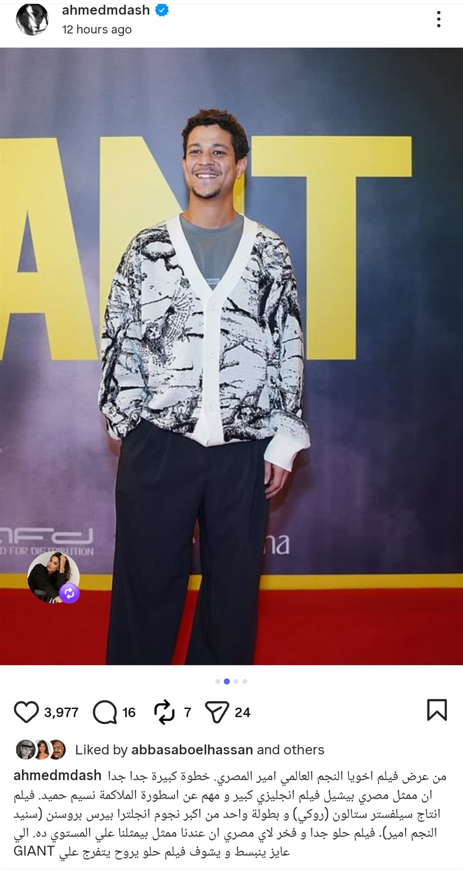 ونشر أحمد داش صورا تجمعهما من العرض الخاص، وذلك من خلال حسابه الرسمي عبر موقع تبادل الصور والفيديوهات القصيرة إنستجرام، وكتب: من عرض فيلم اخويا النجم العالمي امير المصري، خطوة كبيرة جدا جدا ان ممثل مصري بيشيل فيلم انجليزي كبير و مهم عن اسطورة الملاكمة نسيم حميد.