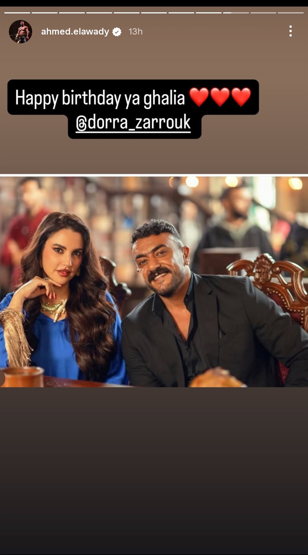 ونشر أحمد العوضي صورة تجمعهما من كواليس تصوير مسلسل علي كلاي، الذي يقدمونه في رمضان 2026، من خلال حسابه الرسمي عبر موقع تبادل الصور والفيديوهات القصيرة إنستجرام، عبر خاصية ستوري، وكتب: كل سنة وانتي طيبة يا غالية.