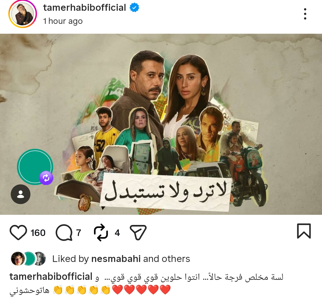 وكتب تامر حبيب من خلال حسابه الرسمي عبر موقع تبادل الصور والفيديوهات القصيرة إنستجرام، قال: لسه مخلص فرجة حالًا.. انتو حلوين قوي قوي قوي.. هاتوحشوني.