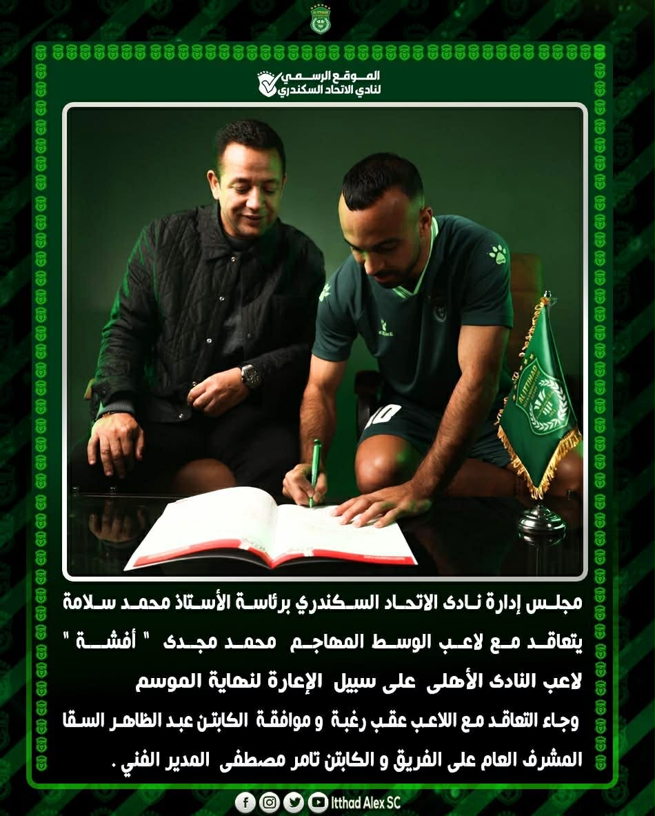 أعلن نادي الاتحاد السكندري تعاقده رسميًا مع لاعب الوسط المهاجم محمد مجدي «أفشة»، على سبيل الإعارة حتى نهاية الموسم الجاري، في إطار تدعيم صفوف الفريق بعناصر خبرة قادرة على صناعة الفارق، ودعم الطموحات الفنية للفريق خلال المرحلة المقبلة من المنافسات.