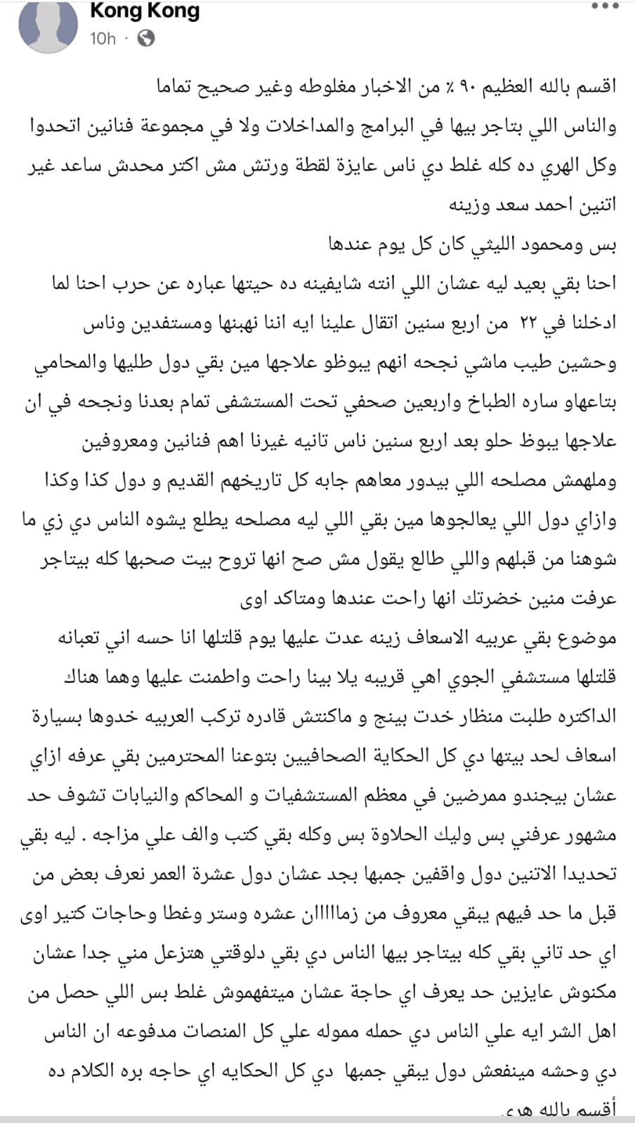 وكتب من خلال حسابه الرسمي عبر موقع التواصل الاجتماعي فيسبوك، قال:اقسم بالله العظيم ٩٠ ٪ من الاخبار مغلوطه وغير صحيح تماما.. والناس اللي بتاجر بيها في البرامج والمداخلات ولا في مجموعة فنانين اتحدوا وكل الهري ده كله غلط دي ناس عايزة لقطة ورتش مش اكتر محدش ساعد غير اتنين احمد سعد وزينه بس ومحمود الليثي كان كل يوم عندها.