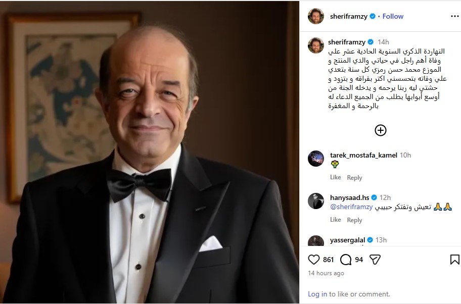 حرص الفنان شريف رمزي على إحياء ذكرى رحيل والده المنتج والموزع محمد حسن رمزي، والتي تحل اليوم الأربعاء الموافق 14 يناير.