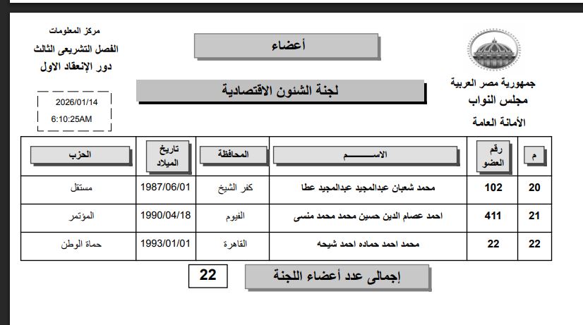 أعلن مجلس النواب رغبات النواب في الانضمام للجان النوعية وجاءت رغبات النواب في الانضمام للجنة الاقتصادية، إحدى اللجان النوعية الأكثر أهمية بالمجلس، في إطار استكمال الإجراءات التنظيمية لدور الانعقاد العادي الأول من الفصل التشريعي الثالث، وتضم اللجنة نخبة من النواب ذوي الخبرة ، بما يعزز دورها المحوري في دراسة مشروعات القوانين، ومراجعة التعديلات الدستورية، وترسيخ أسس العمل البرلماني.