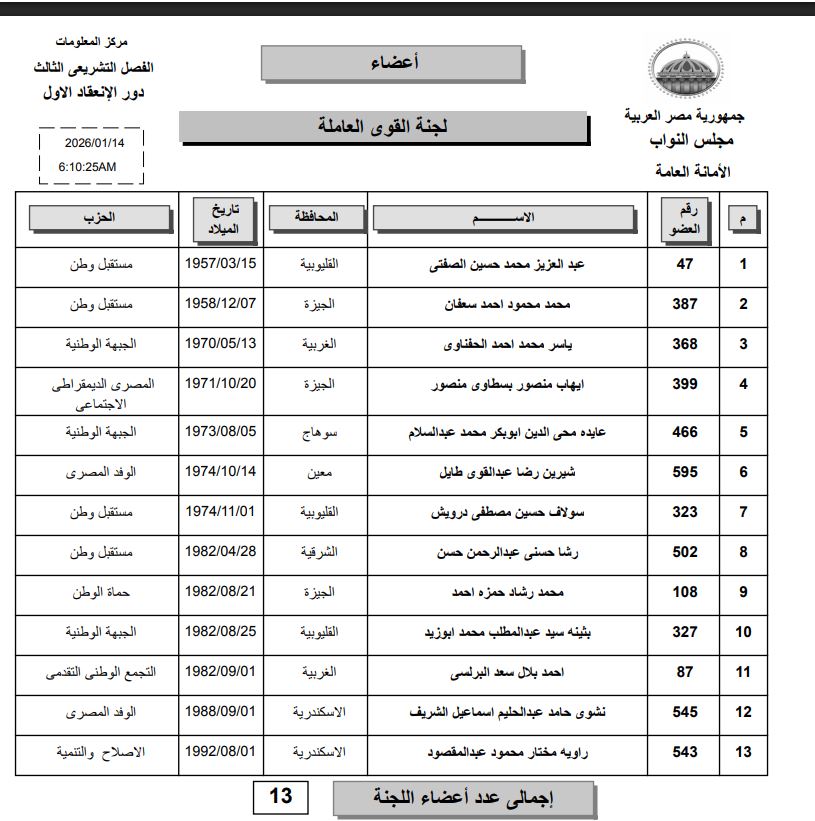 أعلن مجلس النواب رغبات النواب في الانضمام للجان النوعية وجاءت رغبات النواب في الانضمام للجنة القوى العاملة، إحدى اللجان النوعية الأكثر أهمية بالمجلس، في إطار استكمال الإجراءات التنظيمية لدور الانعقاد العادي الأول من الفصل التشريعي الثالث، وتضم اللجنة نخبة من النواب ذوي الخبرة، بما يعزز دورها المحوري في دراسة مشروعات القوانين، وترسيخ أسس العمل البرلماني.
