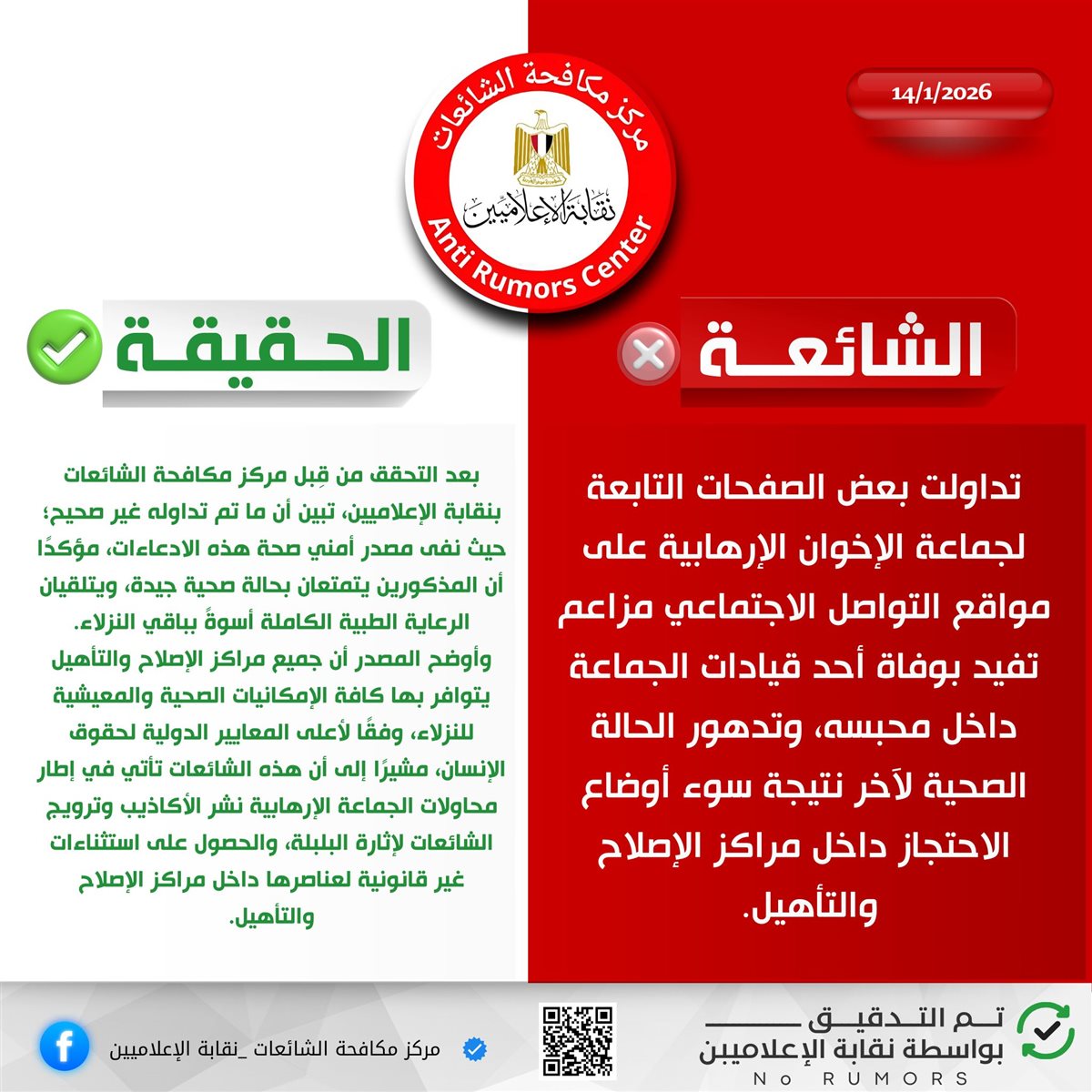 نفى مركز مكافحة الشائعات بنقابة الإعلاميين ما تم تداوله عبر بعض الصفحات ومنصات التواصل بشأن تدهور الحالة الصحية لعدد من عناصر الجماعة الإرهابية داخل مراكز الإصلاح والتأهيل، مؤكدًا أن تلك المزاعم لا أساس لها من الصحة.