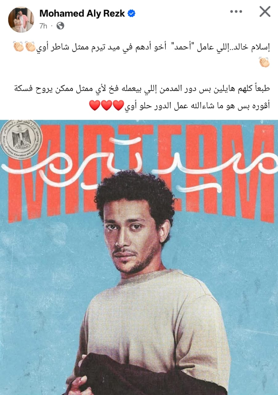 وكتب محمد علي رزق من خلال حسابه الرسمي عبر موقع التواصل الاجتماعي فيسبوك، مُشيدًا بأداء إسلام خالد، قال: إسلام خالد.. اللي عامل أحمد أخو أدهم في ميد تيرم ممثل شاطر أوي.