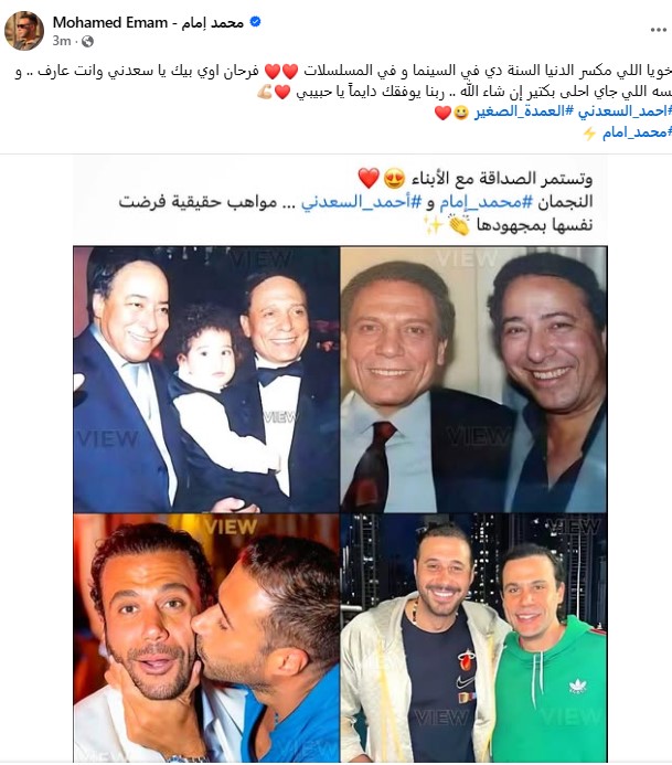 وشارك محمد إمام جمهوره صورا تجمعهما سويًا مستعيدًا ذكريات والده والفنان صلاح السعدني، من خلال حسابه الرسمي عبر موقع التواصل الاجتماعي فيسبوك، وكتب: أخويا اللي مكسر الدنيا السنة دي في السينما و في المسلسلات.. فرحان اوي بيك يا سعدني وانت عارف.. و لسه اللي جاي احلى بكتير إن شاء الله.. ربنا يوفقك دايماً يا حبيبي.