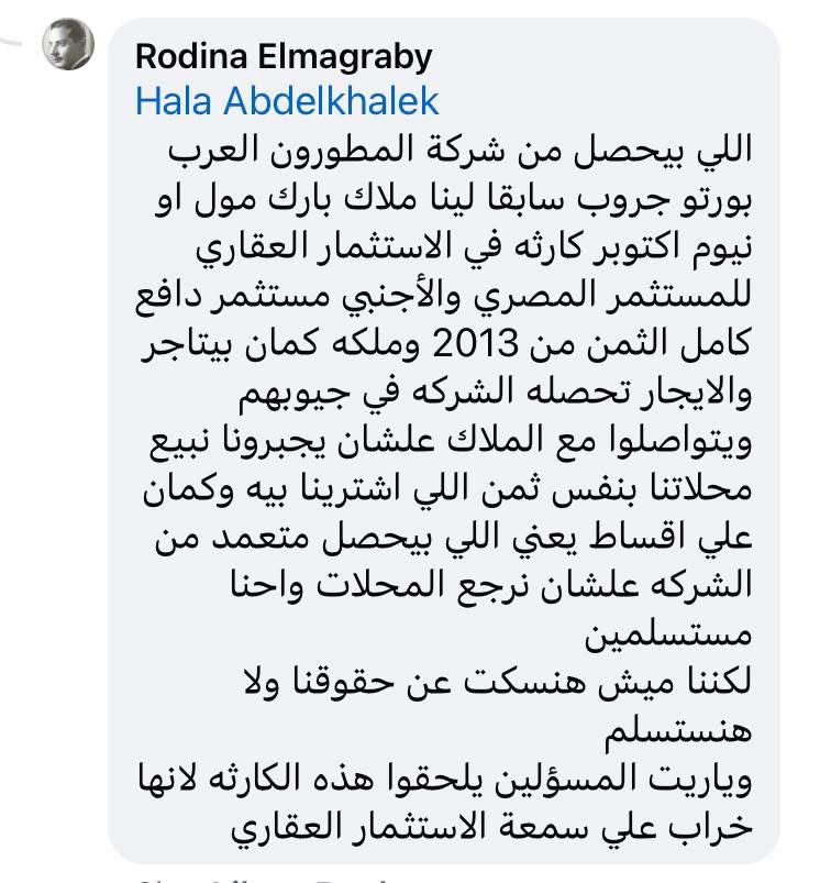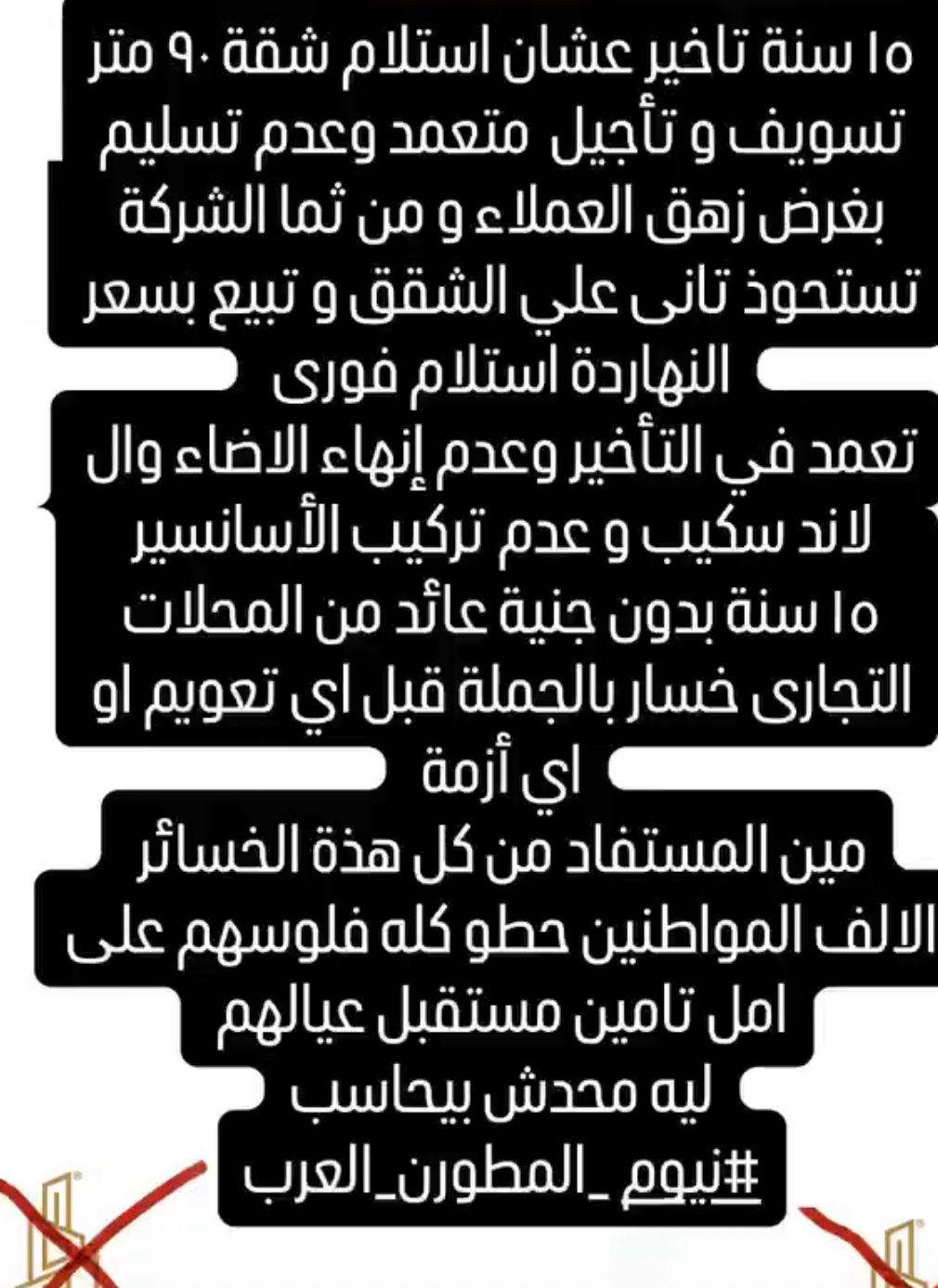 وتابعوا: عدت السنين، 2015 عدت، وبعدها 2016 و2017 و2018، لحد ما المشروع اكتمل شكليا وافتتح الهايبر ماركت اخر 2019، والنهارده احنا في 2025 ولسه الاف الملاك لا استلموا استلام حقيقي ولا شافوا عائد ولا حتى عرفوا حقوقهم فين، عشر سنين كاملة من الانتظار، من القلق، من الوعود اللي على الورق بس.