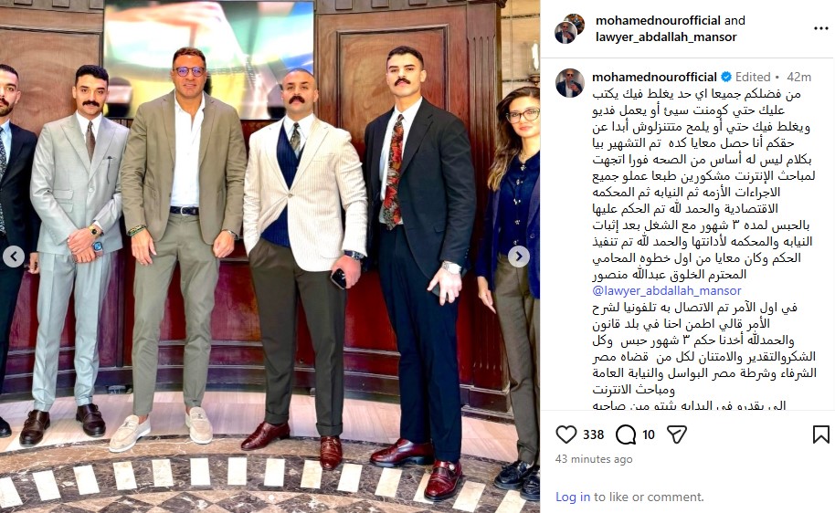 أوضح: في اول الآمر تم الاتصال به تلفونيا لشرح الأمر قالي اطمن احنا في بلد قانون والحمدلله أخدنا حكم ٣ شهور حبس، وكل الشكروالتقدير والامتنان لكل من قضاه مصر الشرفاء وشرطة مصر البواسل والنيابة العامة ومباحث الانترنت