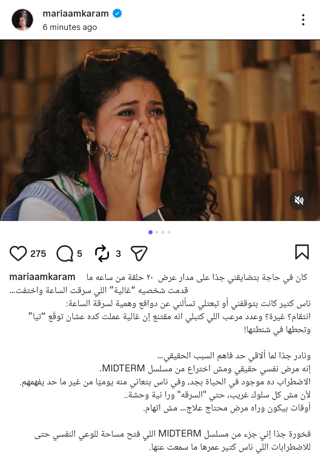 أختتمت: فخورة جدا إني جزء من مسلسل MIDTERM اللي فتح مساحة للوعي النفسي حتى للاضطرابات اللي ناس كتير عمرها ما سمعت عنه.