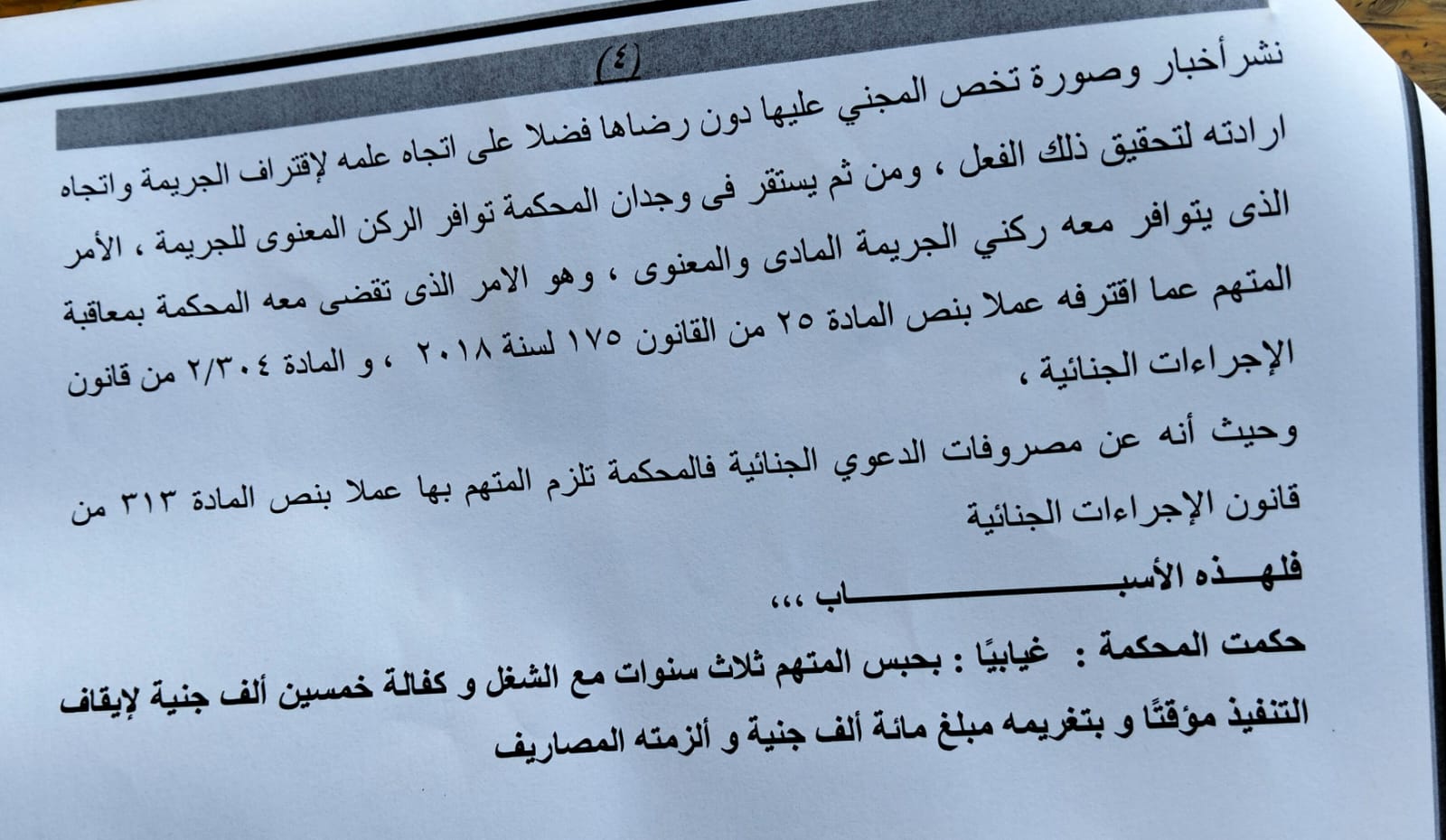 أصدرت محكمة جنح الإسكندرية الاقتصادية (الدائرة الرابعة)، برئاسة المستشار مصطفى محمد مرسي، وعضوية المستشارين أحمد شرباش ومصطفى يسري، حكمًا غيابيًا رادعًا بحق أحد الأشخاص؛ لاتهامه بنشر مقاطع فيديو وعبارات مسيئة لسيدة بمدينة دمنهور عبر مواقع التواصل الاجتماعي، في واقعة أثارت غضبًا واسعًا بين المواطنين.