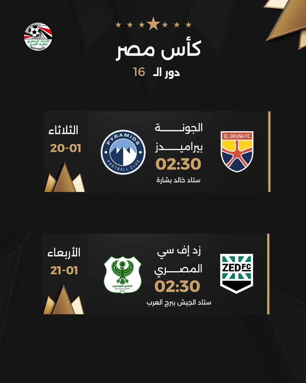 أعلنت لجنة المسابقات بالاتحاد المصري لكرة القدم بشكل رسمي عن مواعيد أول مباراتين في دور الـ 16 من بطولة كأس مصر لموسم 2025-2026، وذلك بعد اكتمال عقد الفرق المتأهلة من دور المجموعات.