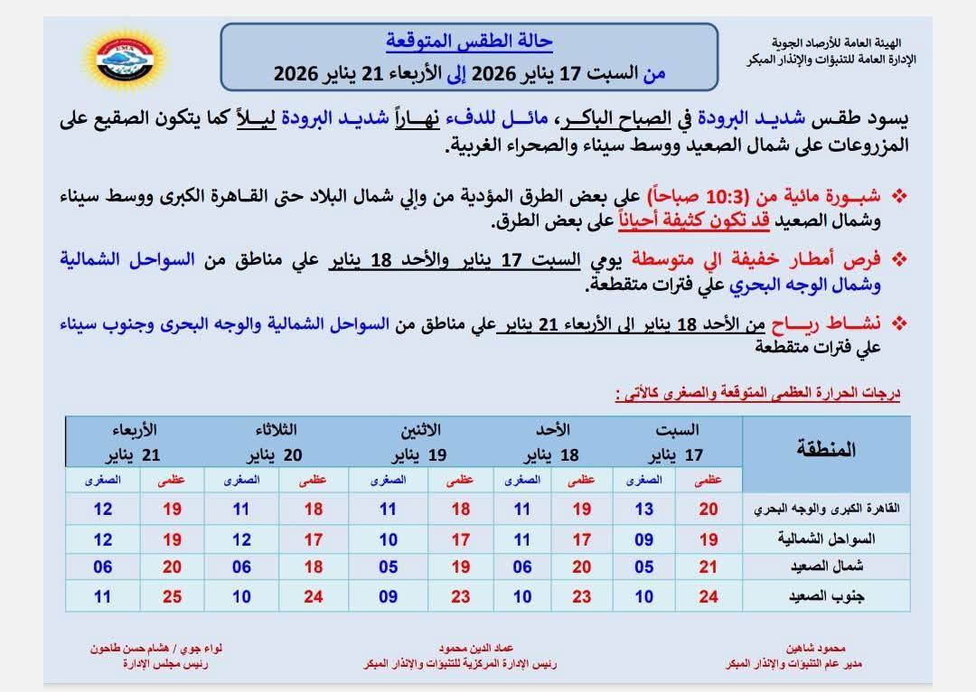 تشير توقعات هيئة الأرصاد إلى أن البلاد ستشهد طقسًا شديد البرودة في الصباح الباكر على جميع الأنحاء، يميل إلى الدفء نهارًا، ويعود شديد البرودة ليلًا مع فرص لتكوّن الصقيع على المزروعات في مناطق شمال الصعيد، وسط سيناء، والصحراء الغربية. وتعد هذه الموجة من أكثر الفترات انخفاضًا في درجات الحرارة منذ بداية فصل الشتاء.