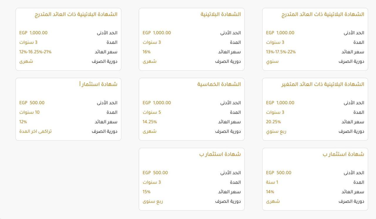 كما يتيح البنك شهادات بعائد متدرج شهرًا بعد شهر بنسب 21% و15.25% و12%، إضافة إلى شهادات بعائد سنوي متدرج يصل إلى 22% و17.5% و13%.