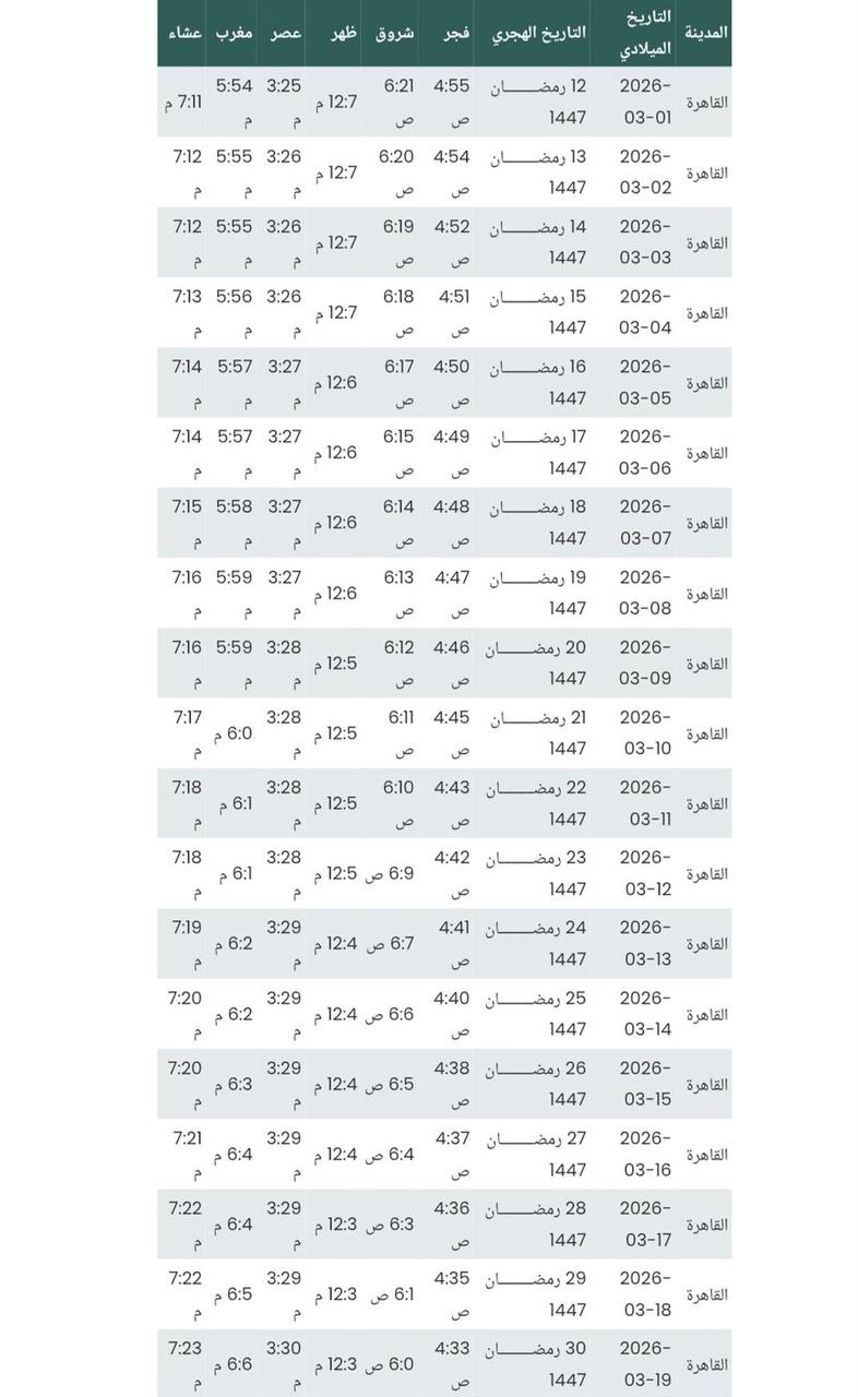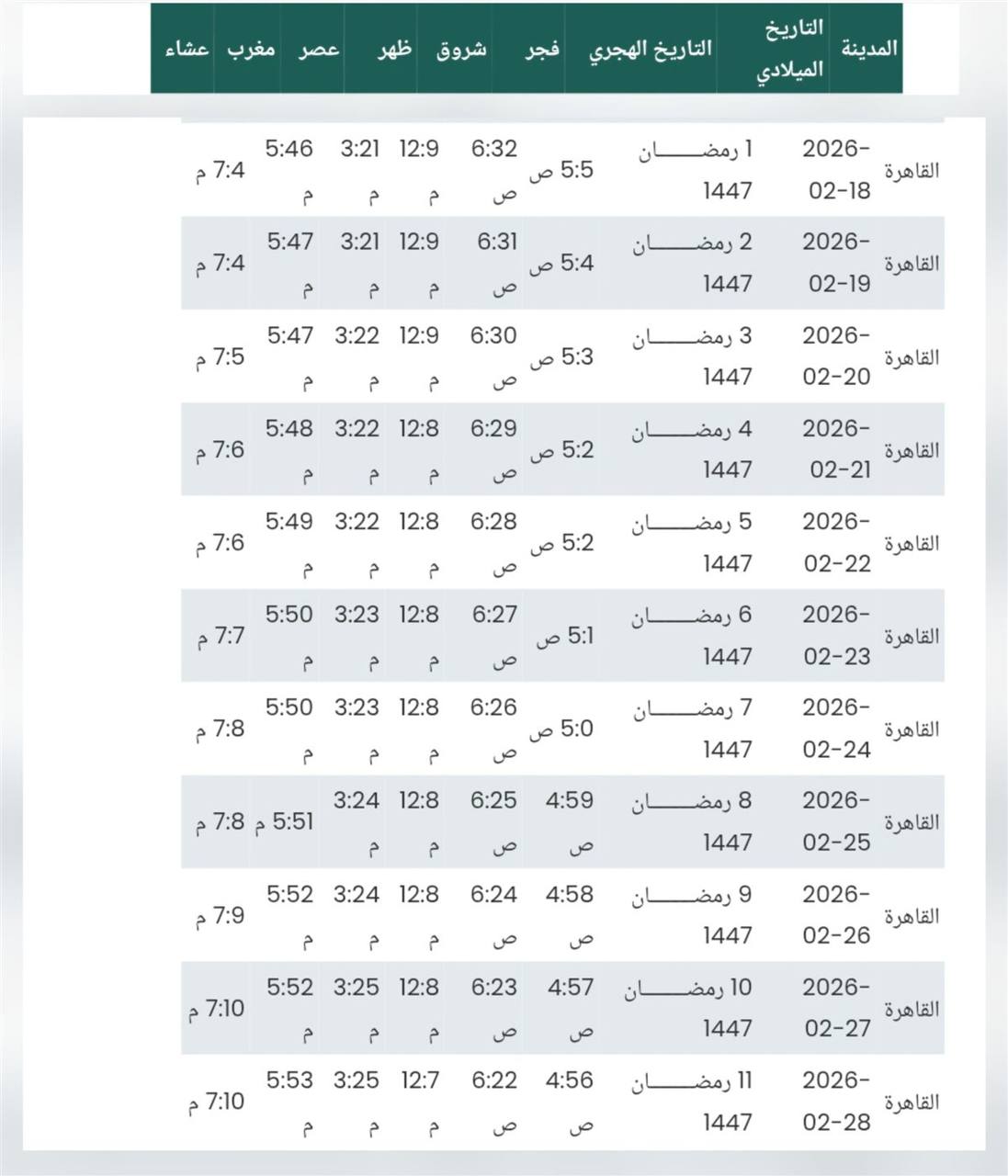 وفق الحسابات الفلكية، سيكون موعد أذان المغرب أول يوم رمضان في تمام الساعة 5:46 مساءً بتوقيت القاهرة، بينما يبدأ الإمساك قبيل الفجر الساعة 5:05 صباحًا، ليصل إجمالي ساعات الصيام إلى نحو 12 ساعة و41 دقيقة.