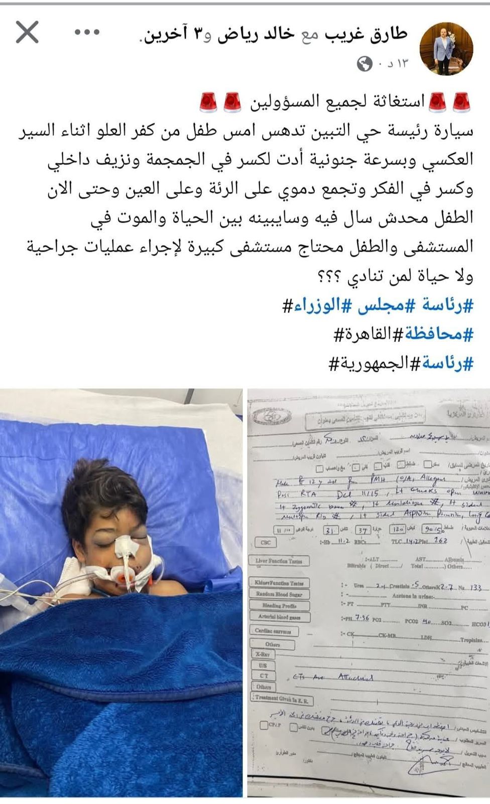 وقال طارق غريب: الطفل ده يتيم (ياسين محمد مرزوق) وخبطته سيارة رئيسة حي التبين امس اثناء السير العكسي وبسرعة جنونية أدت لكسر في الجمجمة ونزيف داخلي وتهشم كامل للفك والأسنان وتجمع دموي على العين والرئه وكسر في عظام الكتف والطفل الان في حالة حرجة وموجود في مستشفى بحلوان ويحتاج لرعاية وعمليات ومفيش اي حد بيسأل في الولد ، سواء من حي التبين او أهلية المتهور الي كان سايق العربية وماشي يدوس على الناس .