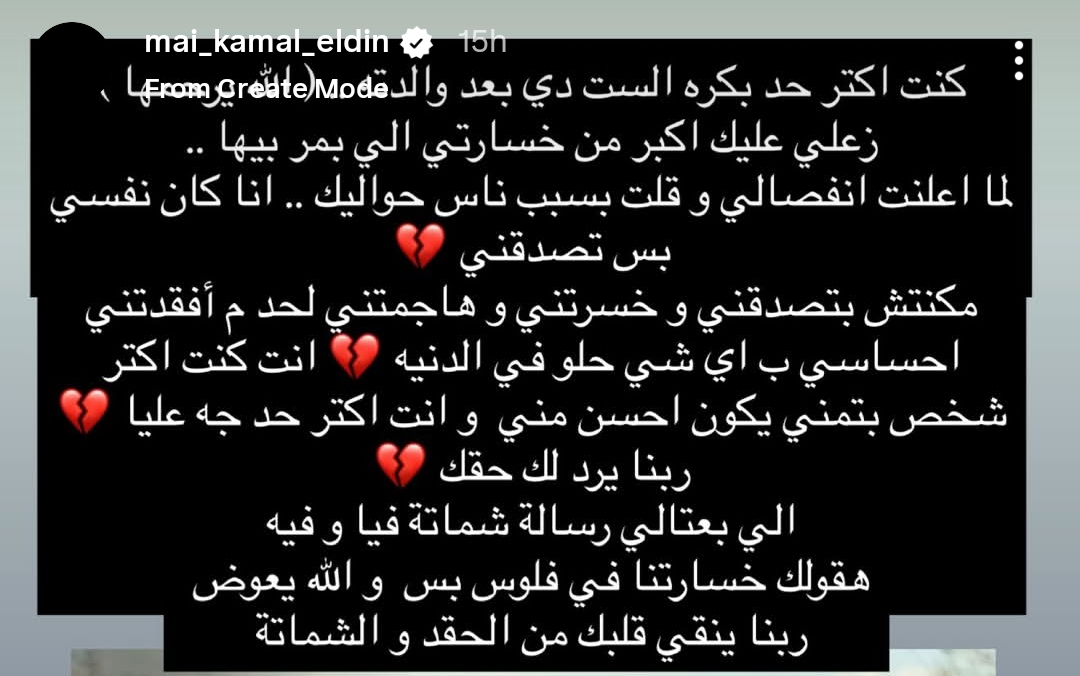 وكتبت مي كمال الدين من خلال حسابها الرسمي عبر موقع تبادل الصور والفيديوهات القصيرة إنستجرام، عبر خاصية ستوري، قالت: كنت اكثر حد بكره الست دي بعد والدتك الله يرحمها.. زعلي عليك اكبر من خسارتي الي بمر بيها .. لما اعلنت انفصالي وقلت بسبب ناس حواليك.