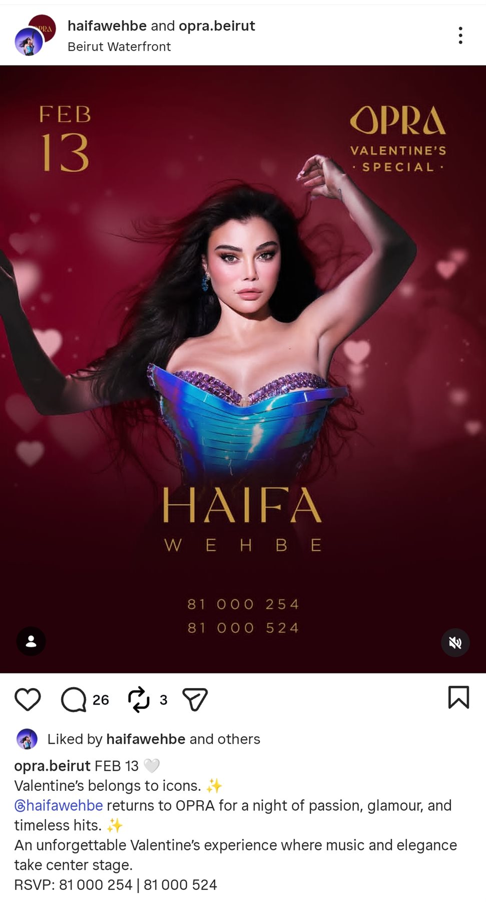 أضاف: تعود هيفاء وهبي إلى دار الأوبرا الملكية (OPRA) لتقدم أمسيةً ساحرةً من الشغف والجمال وأروع الأغاني الخالدة.