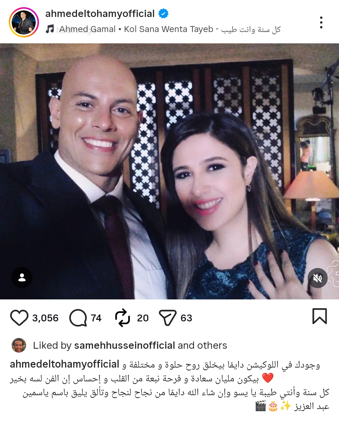 ونشر التهامي صورة تجمعهما سويًا، من خلال حسابه الرسمي عبر موقع تبادل الصور والفيديوهات القصيرة إنستجرام، وكتب: وجودك في اللوكيشن دايما بيخلق روح حلوة و مختلفة و بيكون مليان سعادة و فرحة نبعة من القلب و إحساس إن الفن لسه بخير كل سنة وأنتي طيبة يا يسو وإن شاء الله دايما من نجاح لنجاح وتألق يليق باسم ياسمين عبد العزيز.