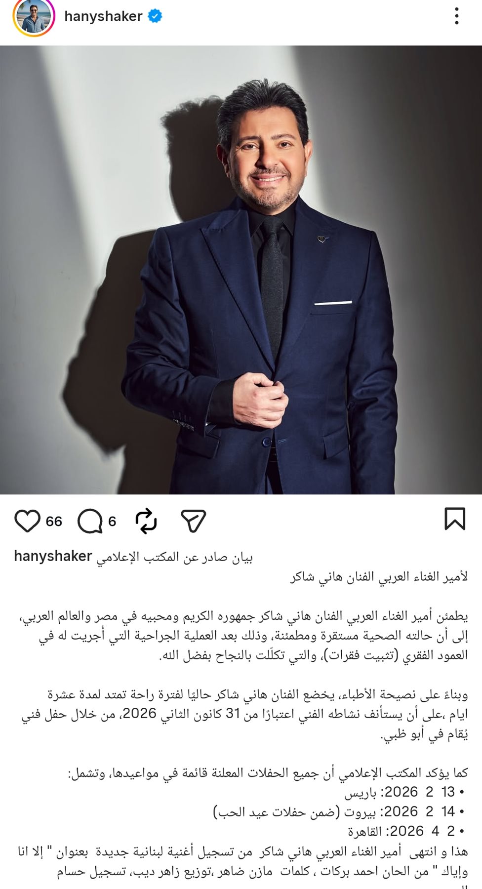 أضاف: وبناءً على نصيحة الأطباء، يخضع الفنان هاني شاكر حاليا لفترة راحة تمتد لمدة عشرة ايام ، على أن يستأنف نشاطه الفني اعتبارا من 31 كانون الثاني 2026، من خلال حفل فني يقام في أبو ظبي.