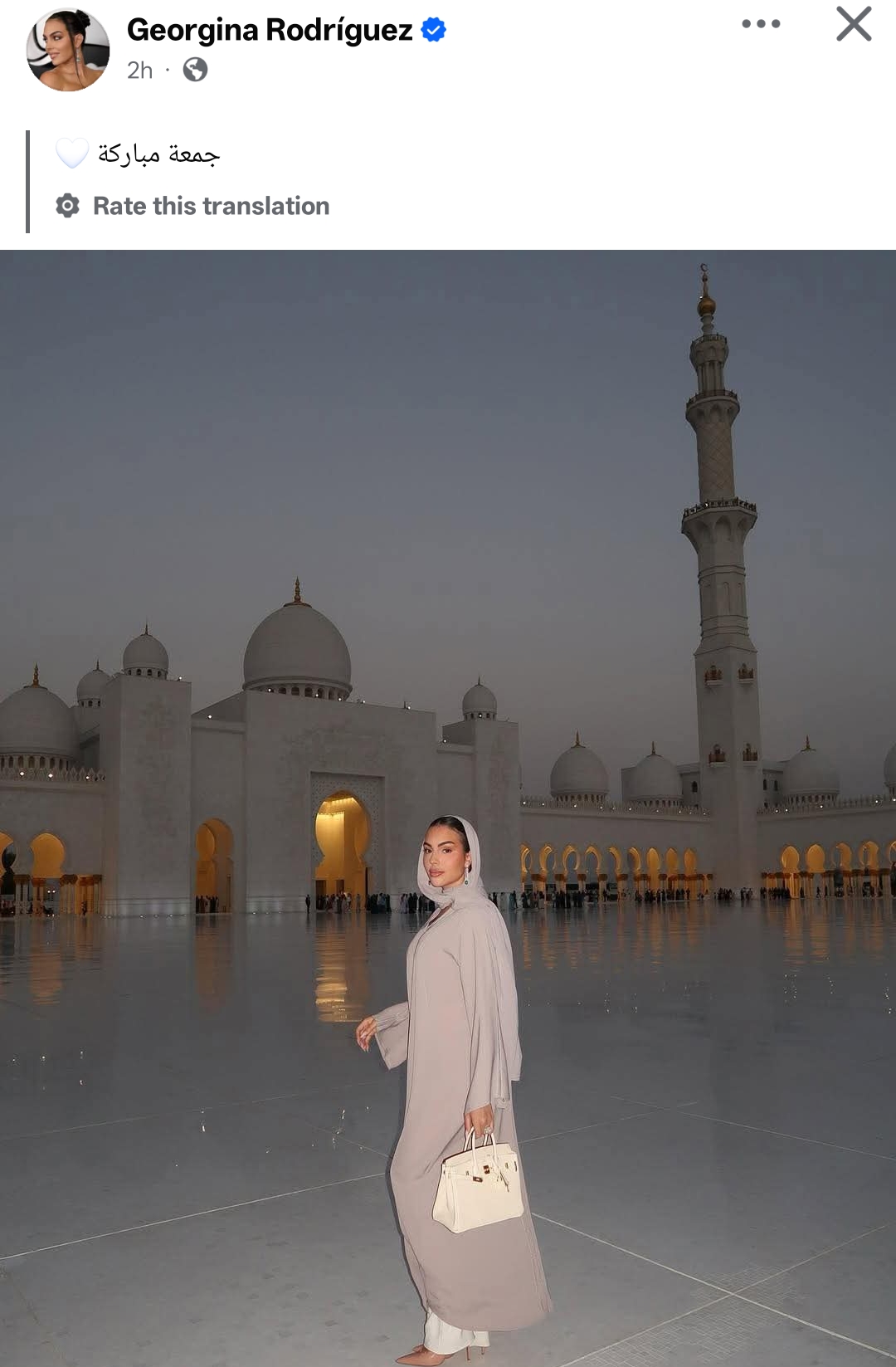 ونشرت جورجينا صورة لها بالحجاب، من خلال حسابها الرسمي عبر موقع التواصل الاجتماعي فيسبوك، وعلقت: جمعة مباركة.
