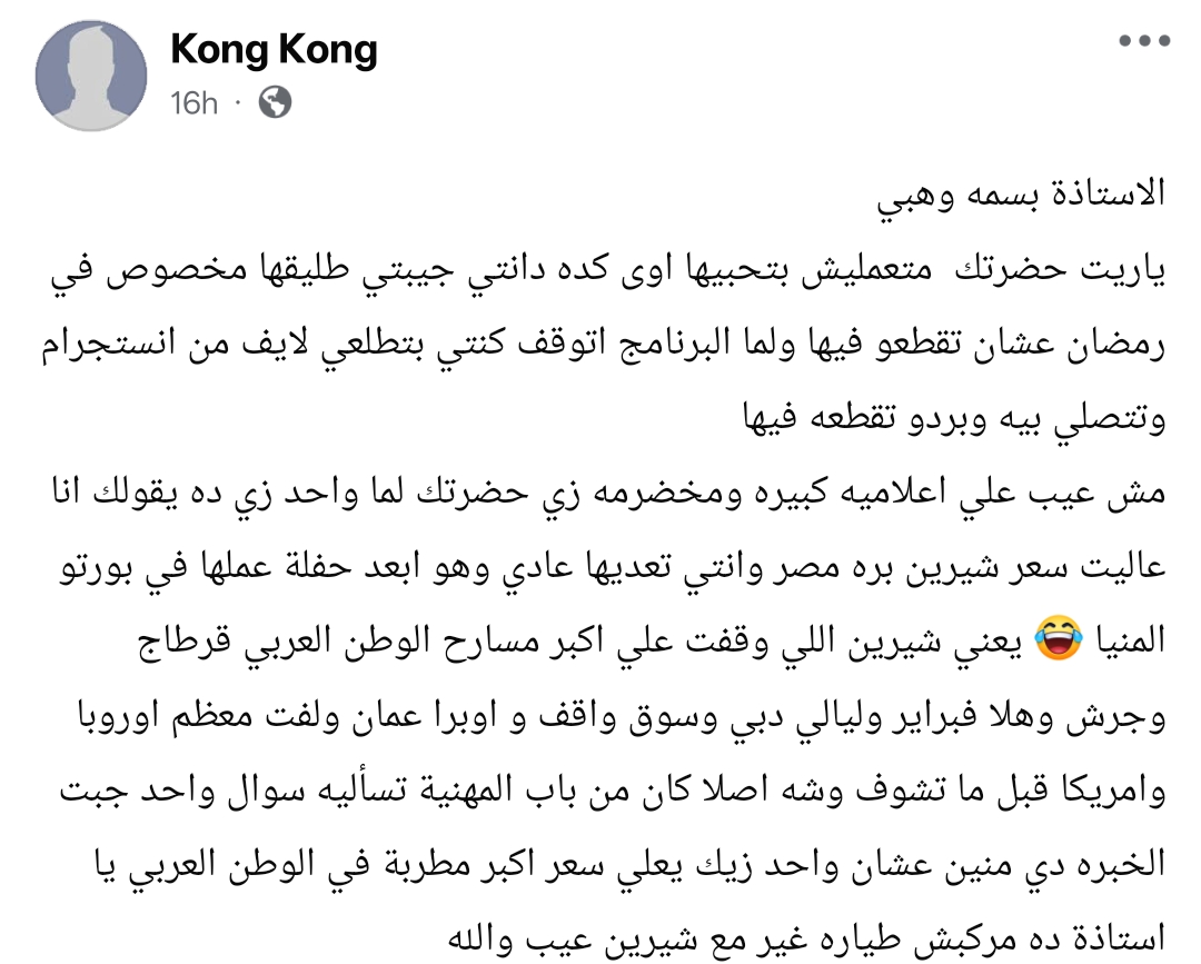 أضاف: مش عيب علي اعلاميه كبيره ومخضرمه زي حضرتك لما واحد زي ده يقولك انا عاليت سعر شيرين بره مصر وانتي تعديها عادي وهو ابعد حفلة عملها في بورتو المنيا.