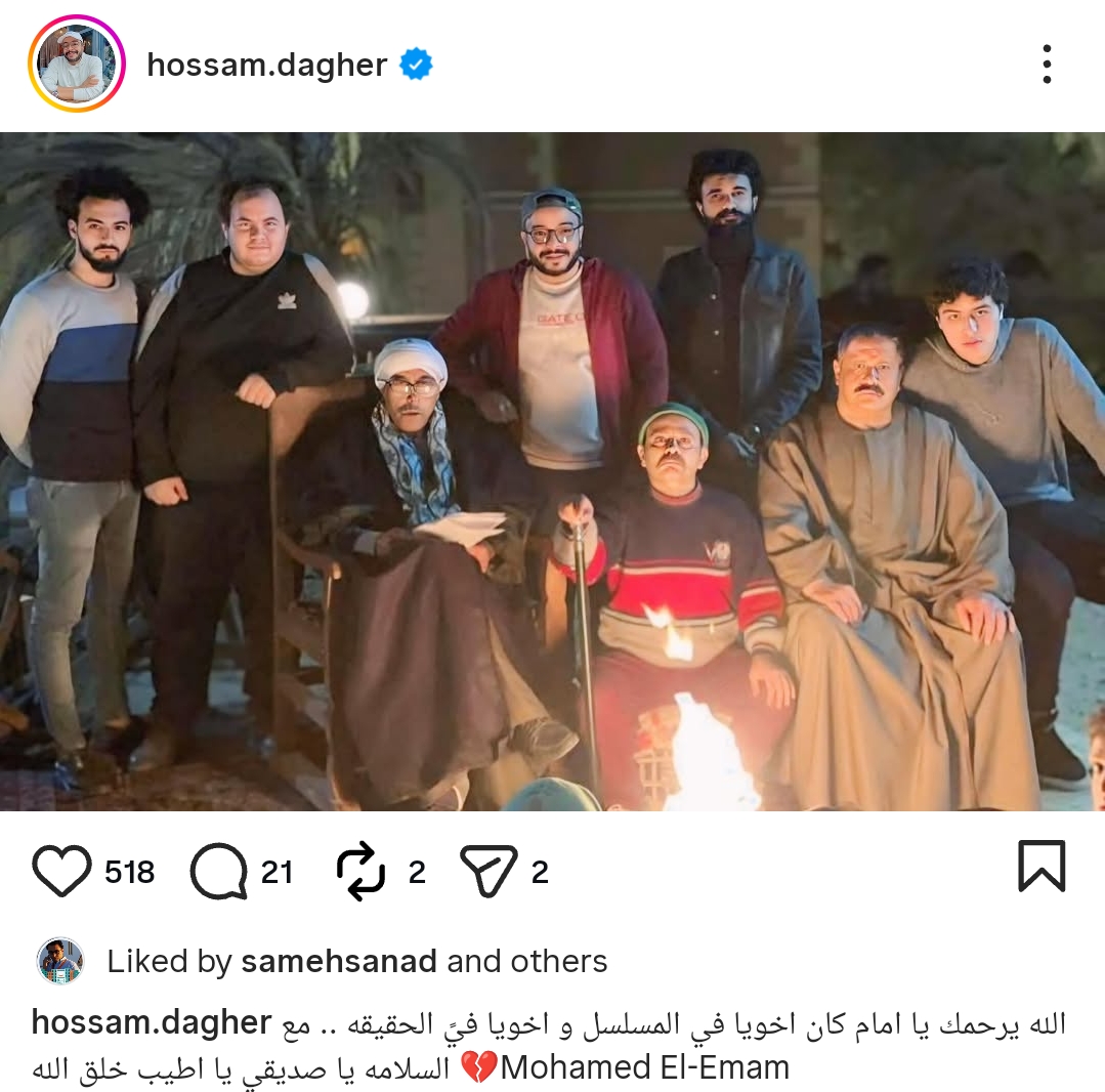 نعي الفنان حسام داغر الفنان الراحل محمد الإمام، الذي رحل عن عالمنا أمس، الجمعة، الموافق 16 يناير بعد تعرضه لـ أزمة صحية خطيرة.