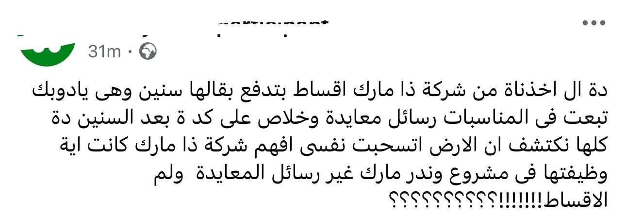 وقال أحد المتضررين: دة اللي اخدناه من شركة ذا مارك اقساط بتدفع بقالها سنين وهى يادوبك تبعت فى المناسبات رسائل معايدة وخلاص على كد ة بعد السنين دة كلها نكتشف ان الارض اتسحبت نفسى افهم شركة ذا مارك كانت اية وظيفتها فى مشروع وندر مارك غير رسائل المعايدة ولم الاقساط.