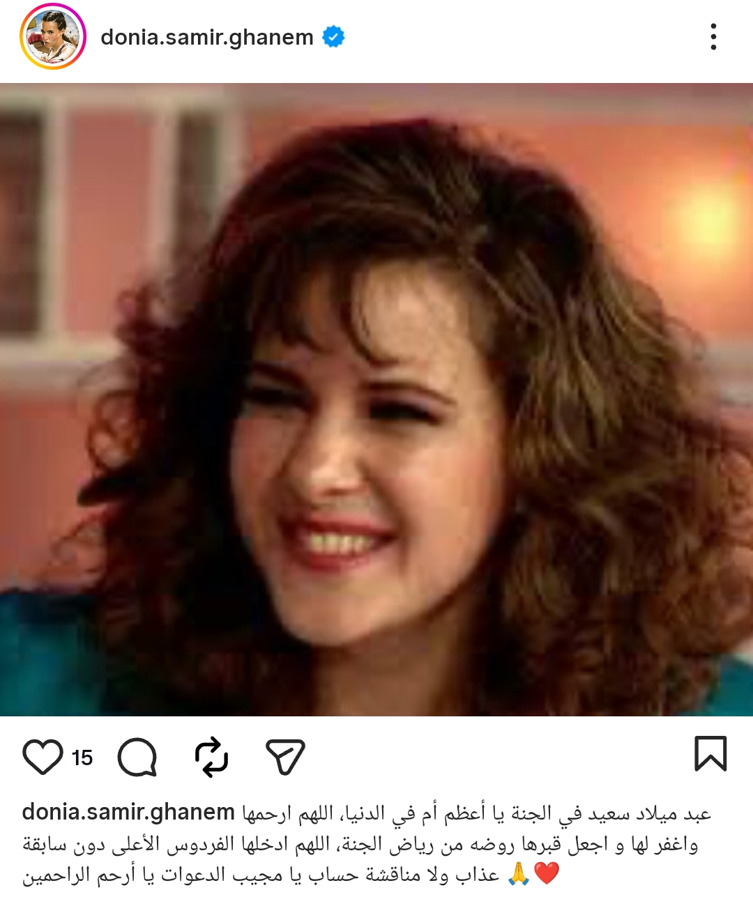 ونشرت دنيا صورة لوالدتها، من خلال حسابها الرسمي عبر موقع تبادل الصور والفيديوهات القصيرة إنستجرام، وكتبت: عبد ميلاد سعيد في الجنة يا أعظم أم في الدنيا، اللهم ارحمها واغفر لها و اجعل قبرها روضه من رياض الجنة، اللهم ادخلها الفردوس الأعلى دون سابقة عذاب ولا مناقشة حساب يا مجيب الدعوات يا أرحم الراحمين.