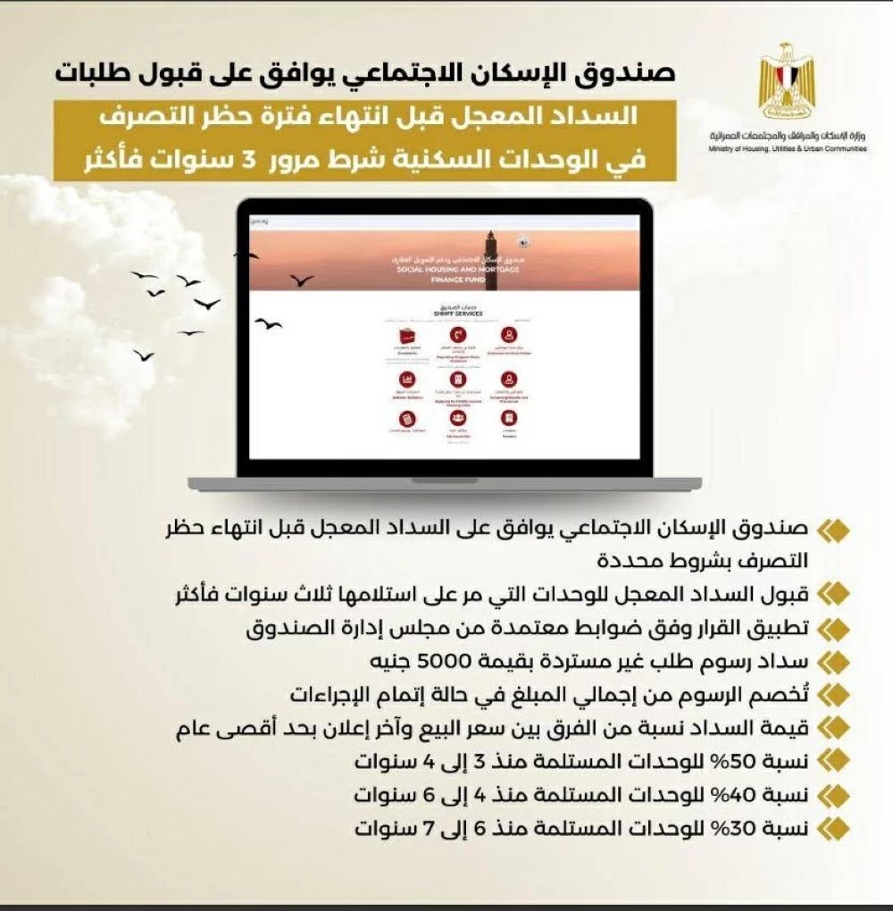وحدد الصندوق ثلاث شرائح مئوية للسداد المعجل وفك الحظر، ترتبط بشكل مباشر بالمدة الزمنية التي انقضت منذ استلام الوحدة، وجاءت كالتالي: