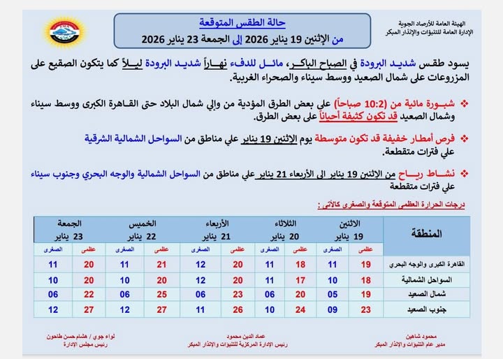 حالة الطقس المتوقعة في الفترة من الإثنين 19 يناير وحتى يوم الجمعة 23 يناير 2026