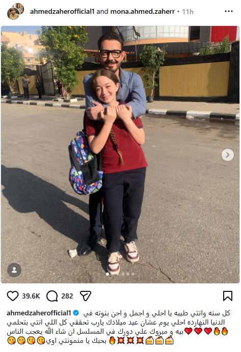 هنئ الفنان أحمد زاهر ابنته منى بعيد ميلادها، الذي تحتفل به اليوم، الاثنين، الموافق 19 يناير، معبرًا عن مدى حبه لها ومتمنيًا لها النجاح.
