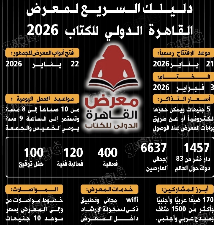 حددت وزارة الثقافة موعد الافتتاح الرسمي لمعرض القاهرة الدولي للكتاب 2026 يوم 21 يناير 2026، على أن يبدأ استقبال الجمهور من 22 يناير وحتى 3 فبراير 2026.