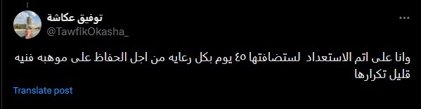 وكتب توفيق عكاشة من خلال حسابه الرسمي عبر موقع التواصل الاجتماعي إكس: وأنا على أتم الاستعداد لاستضافتها ٤٥ يوم بكل رعايه من أجل الحفاظ على موهبة فنية قليل تكرارها.