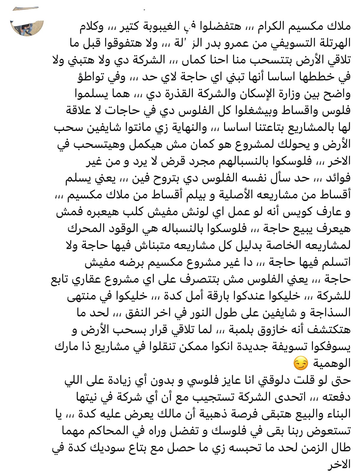 وتابع متضرر اخر: ربنا ينتقم منهم خدوا مننا ملايين وفى الاخر يقول الارض اتسحبت، وأضاف اخر: أنا طلبت إن فلوسى ترجع لى الشركة رفضت معهاش فلوس بتجبرنى إني اروح مشروع تاني مر عليه 7 سنين وماخلصش لغاية اللحظة دي.