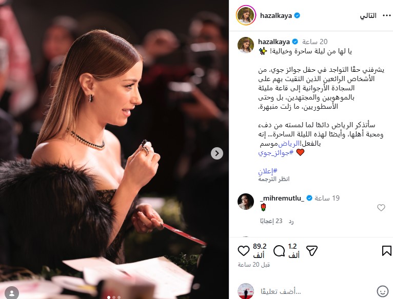 أشادت الفنانة التركية هازال كايا بموسم الرياض وحفل جوي اووردز، الذي أُقيم في المملكة العربية السعودية يوم السبت الماضي.