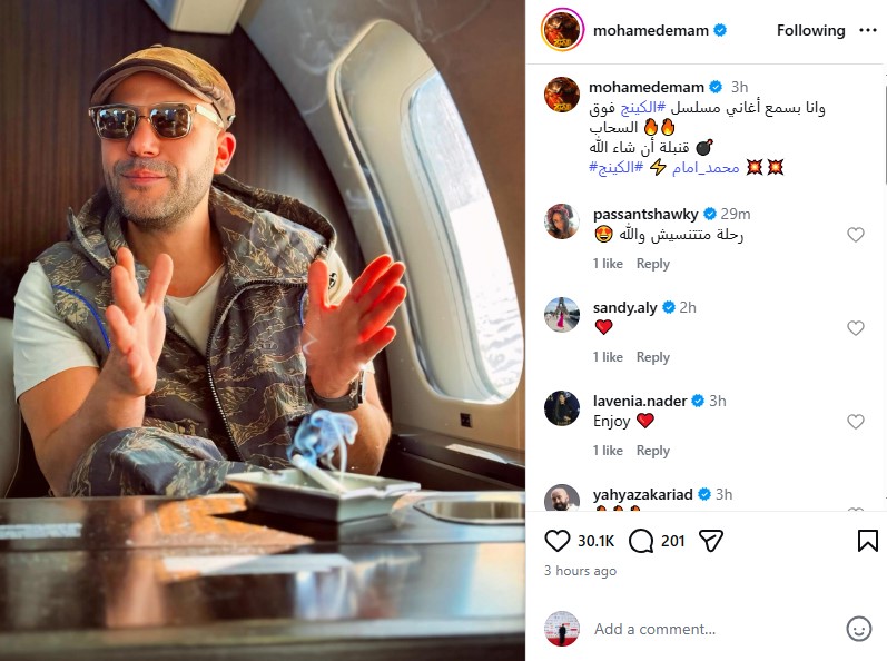 ونشر محمد إمام صورة له من الطائرة، من خلال حسابه الرسمي عبر موقع تبادل الصور والفيديوهات القصيرة إنستجرام، وكتب: وأنا بسمع أغاني مسلسل الكينج فوق السحاب.. قنبلة إن شاء الله.