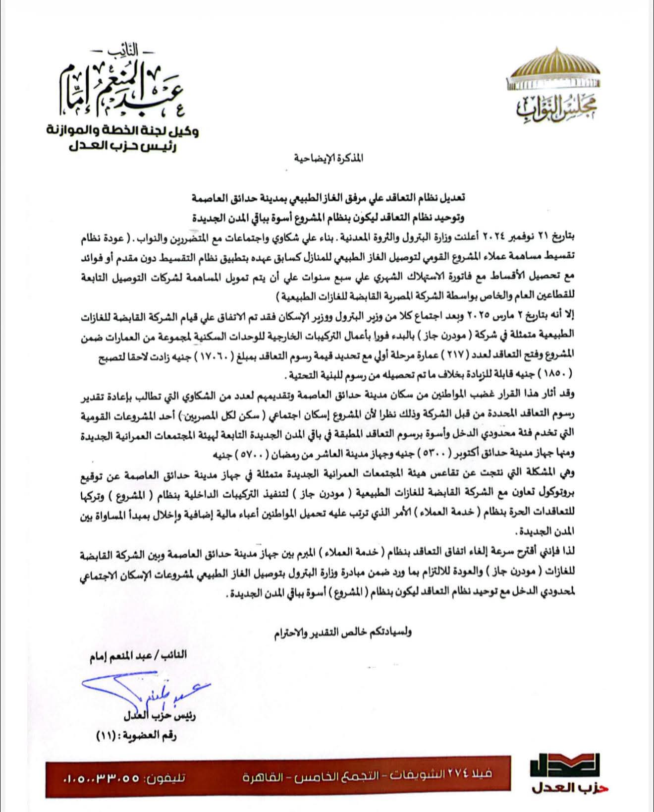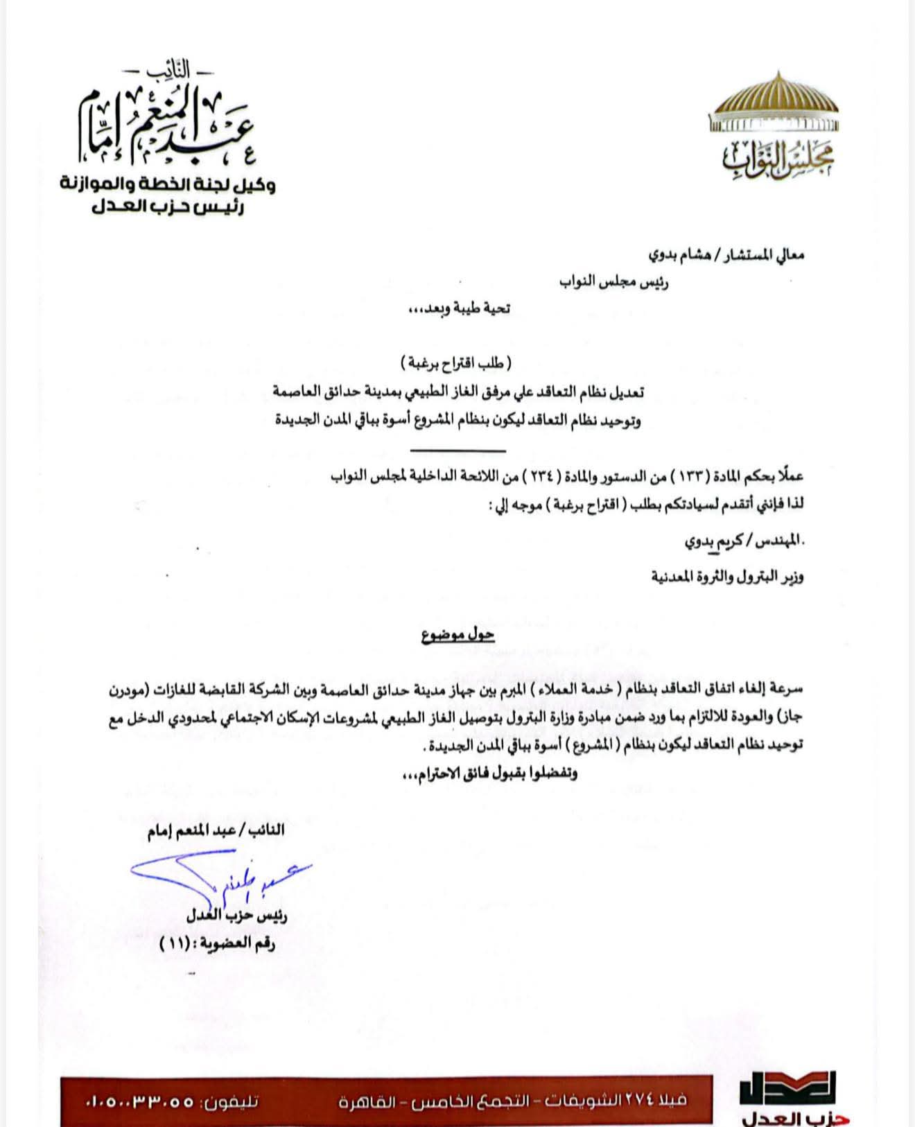 تقدّم النائب عبدالمنعم إمام، عضو مجلس النواب ورئيس حزب العدل، باقتراح برغبة موجّه إلى المهندس كريم بدوي، وزير البترول والثروة المعدنية، طالب فيه بسرعة إلغاء نظام التعاقد الحالي بنظام «خدمة العملاء» المبرم بين جهاز مدينة حدائق العاصمة وشركة مودرن جاز، والعودة إلى الالتزام بمبادرة وزارة البترول الخاصة بتوصيل الغاز الطبيعي لمشروعات الإسكان الاجتماعي لمحدودي الدخل.
