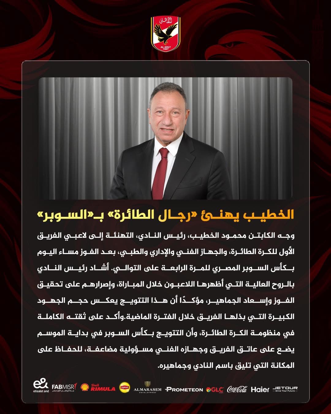 وجه الكابتن محمود الخطيب، رئيس النادي الأهلي ، التهنئة إلى لاعبي الفريق الأول للكرة الطائرة، والجهاز الفني والإداري والطبي، بعد الفوز مساء اليوم بكأس السوبر المصري للمرة الرابعة على التوالي.