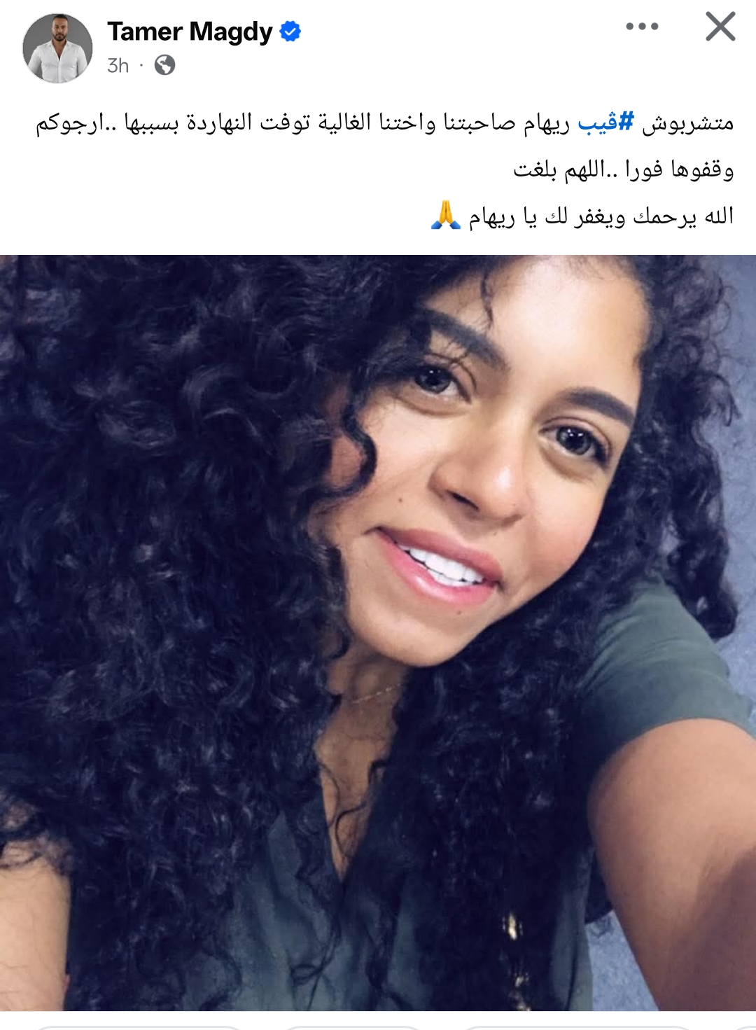 وأوضح تامر مجدي أن الفيب والتدخين كان السبب في تدهور حالتها الصحية ووفاتها، وكتب من خلال حسابه الرسمي عبر موقع التواصل الاجتماعي فيسبوك، قال: متشربوش فيب ريهام صاحبتنا واختنا الغالية توفت النهاردة بسببها.. ارجوكم وقفوها فورًا.. اللهم بلغت.