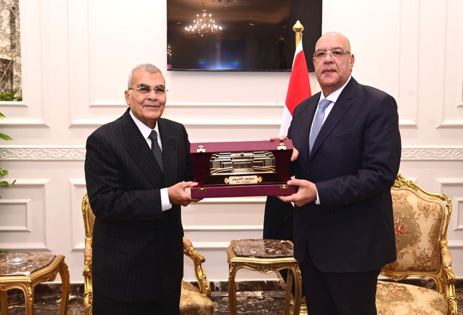 في ختام اللقاء، قدّم المستشار عصام فريد درع مجلس الشيوخ إلى المستشار هشام بدوي، تعبيراً عن التقدير وحرص المجلسين على تعزيز أطر التعاون والتنسيق بينهما.
