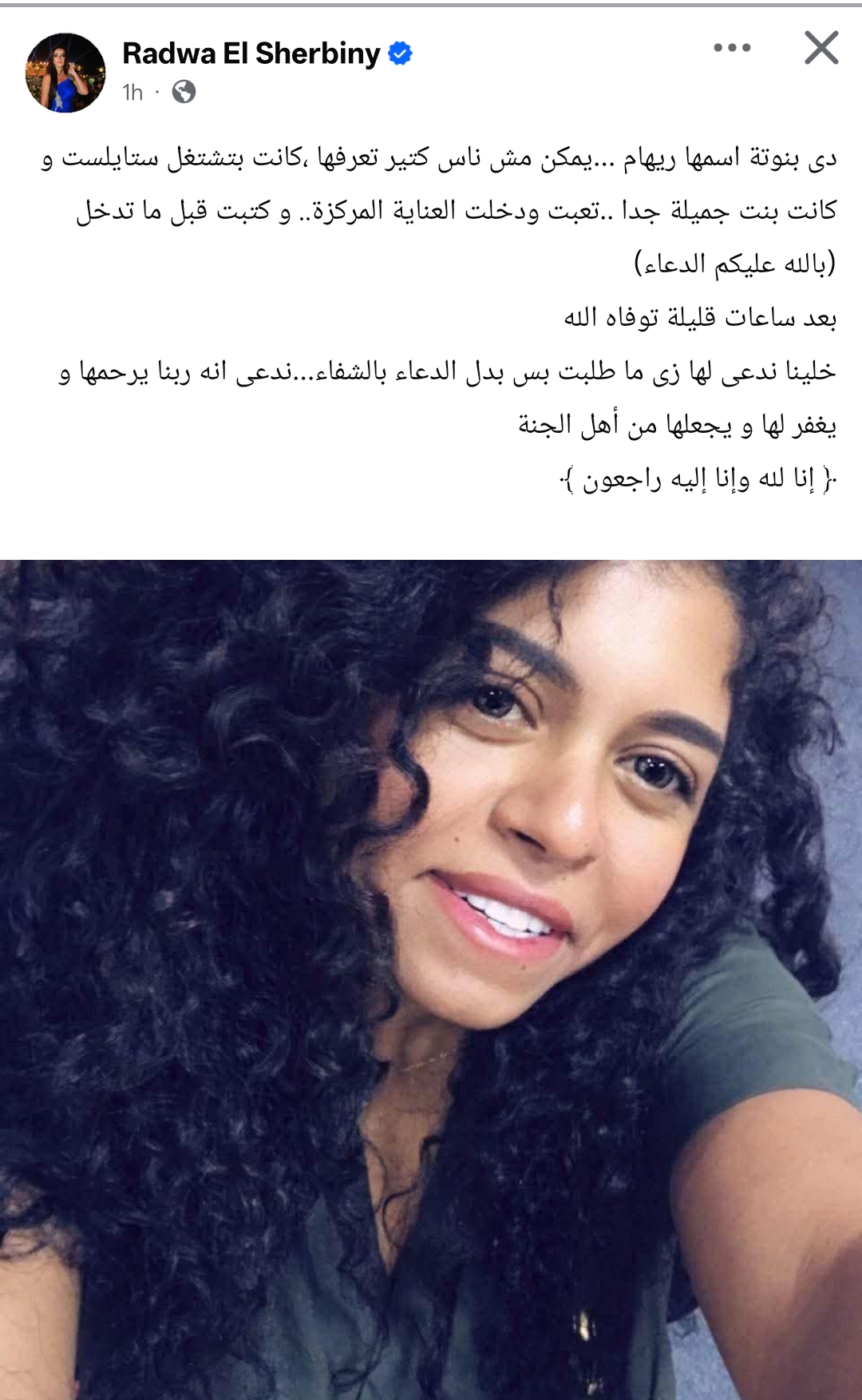 ونشرت رضوى الشربيني صورة لها، من خلال حسابها الرسمي عبر موقع التواصل الاجتماعي فيسبوك، ونعتها بكلمات حزينة، وكتبت: دى بنوتة اسمها ريهام.. يمكن مش ناس كتير تعرفها ، كانت بتشتغل ستايلست و كانت بنت جميلة جدا.. تعبت ودخلت العناية المركزة.. وكتبت قبل ما تدخل بالله عليكم الدعاء.